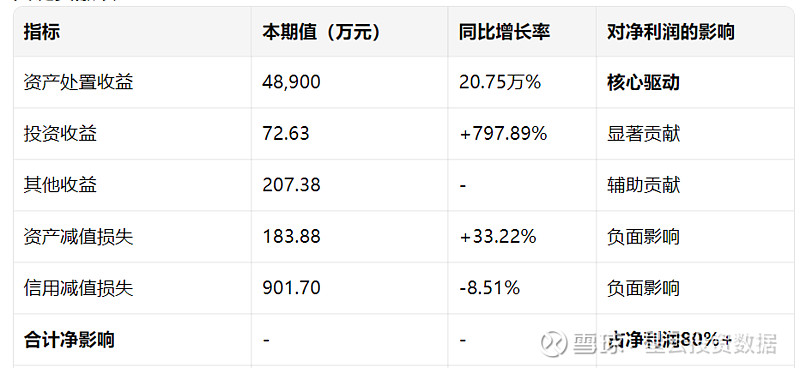 - 资产处置收益:4.89亿元的巨额收益(同比暴涨20.75万倍)直接推高净利润,主因公司处置了高价值资产(如固定资产或股权)。