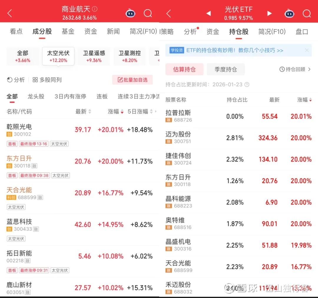 光伏这么扶不起的板块也被激发了,就在第二天,23日,太空光伏板块大涨12.2%,光伏上下游各大板块掀起涨停潮,东方日升,迈为股份,晶科,协鑫,隆基,钧达等全部涨停,光伏ETF都接近涨停,涨幅超过10%的票多达33支。确实感觉是从马上要冻死街头又迅速转场蹦起了迪,开香槟庆祝。市场就是这么魔幻啊。