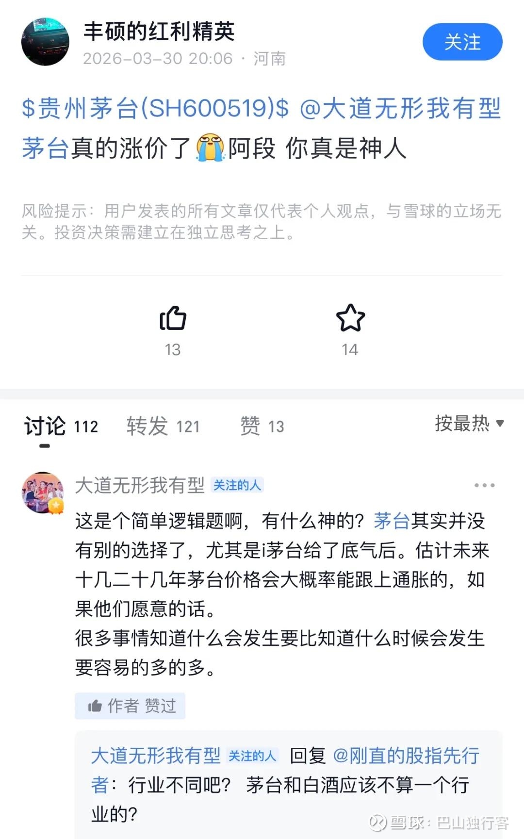 市场追踪茅台的大V很多,段永平算是总头领,前面好几次公开采访,茅台都是避不开的话题,所以我特意打开雪球,看看他对于茅台涨价有什