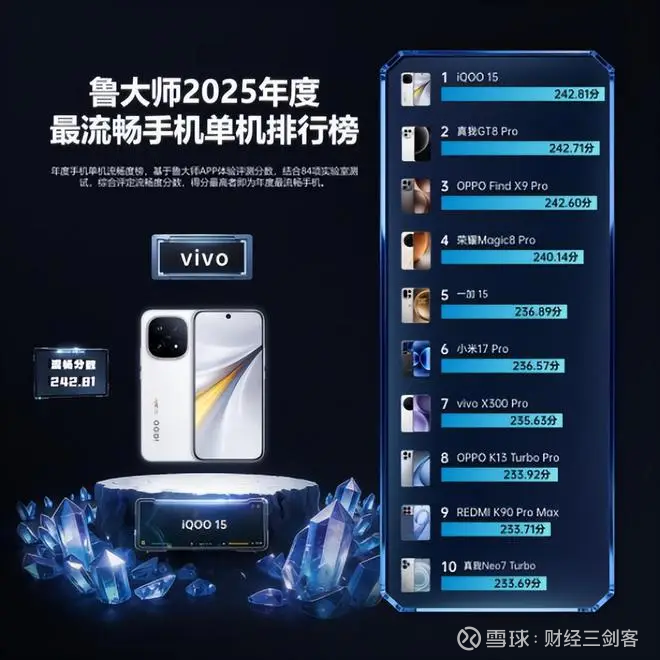 iQOO 15 获评“2025年度最流畅手机单机”。凭借骁龙8至尊版与 OriginOS 6 自研蓝河流畅引擎,它通过双渲染架构显著提升应用启动速度与帧率稳定性,以 242.81 的流畅分问鼎榜首,代表了“硬件+系统调校”协同的顶级实现。