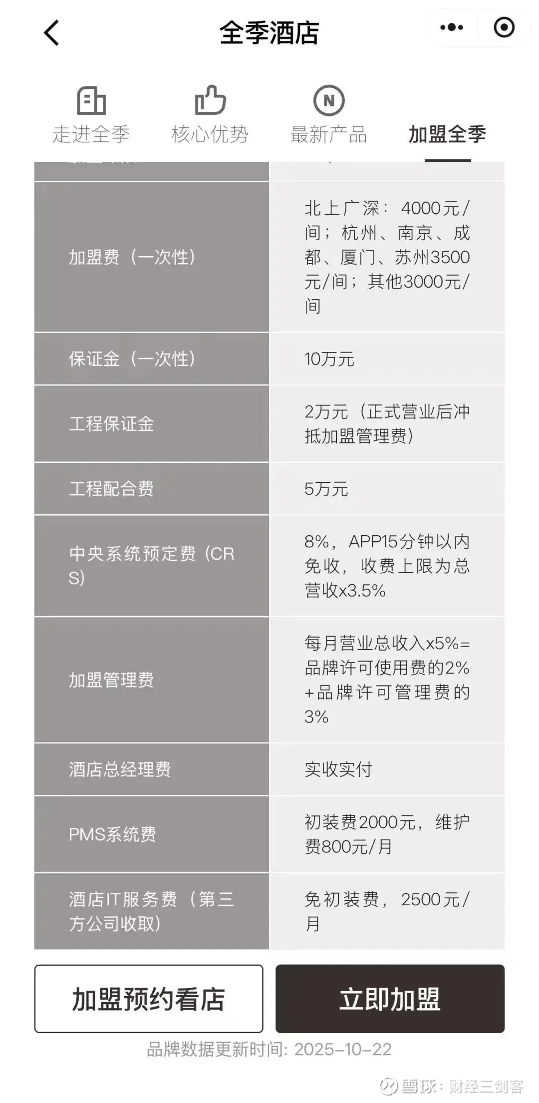从收费项目来看,华住集团的收费名目繁多。据《财中社》报道,在加盟初期,就向加盟商收取首次特许经营费,例如加盟全季酒店,标准是加盟费2800元/间(不少于80间客房),一次性加盟费不低于18万元。后续还有每月总营收5%的加盟管理费(品牌使用费2%+品牌支持费3%)。此外,还收取使用中央预订系统的预订费(一般为房价的8%,上限相当于酒店总收入的3.5%)以及对在加盟酒店加入华住会的客户收取会员注册费(一般介于每位会员15元至135元,视会员等级而定)。这意味着,从客户在酒店线下扫码注册会员开始,到后续通过CRS办理入住,华住会均向加盟门店收取“人头费”。如此高昂且复杂的收费体系,极大地压缩了加盟商的利润空间,许多加盟商在这样的重压下,经营举步维艰。