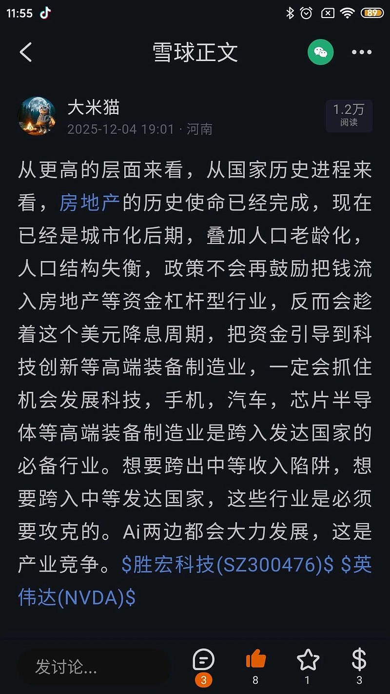 从国家历史进程来看,从社会发展趋势来看,从产业升级趋势来看,由人口总量带来的消费需求在2022年已经见顶,预示着老登资产的荣光一去不复返。想要迈入中等发达国家,科技,Ai人工智能必不可少。发展科技、发展高端装备制造业是迈入发达国家的必备行业。$胜宏科技(SZ300476)$ $英伟达(NVDA)$