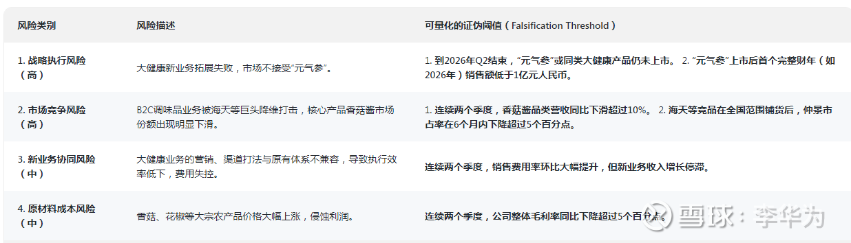 估值结论:当前约24倍的TTM市盈率,基本反映了上述预测的稳健增长,但完全没有为大健康业务这一高赔率的“期权”定价。如果“元气参”被市场验证,哪怕只贡献1-2亿元的早期营收,公司的估值中枢也有望向30-40倍甚至更高水平的成长性消费品公司看齐,带来显着的估值提升空间。