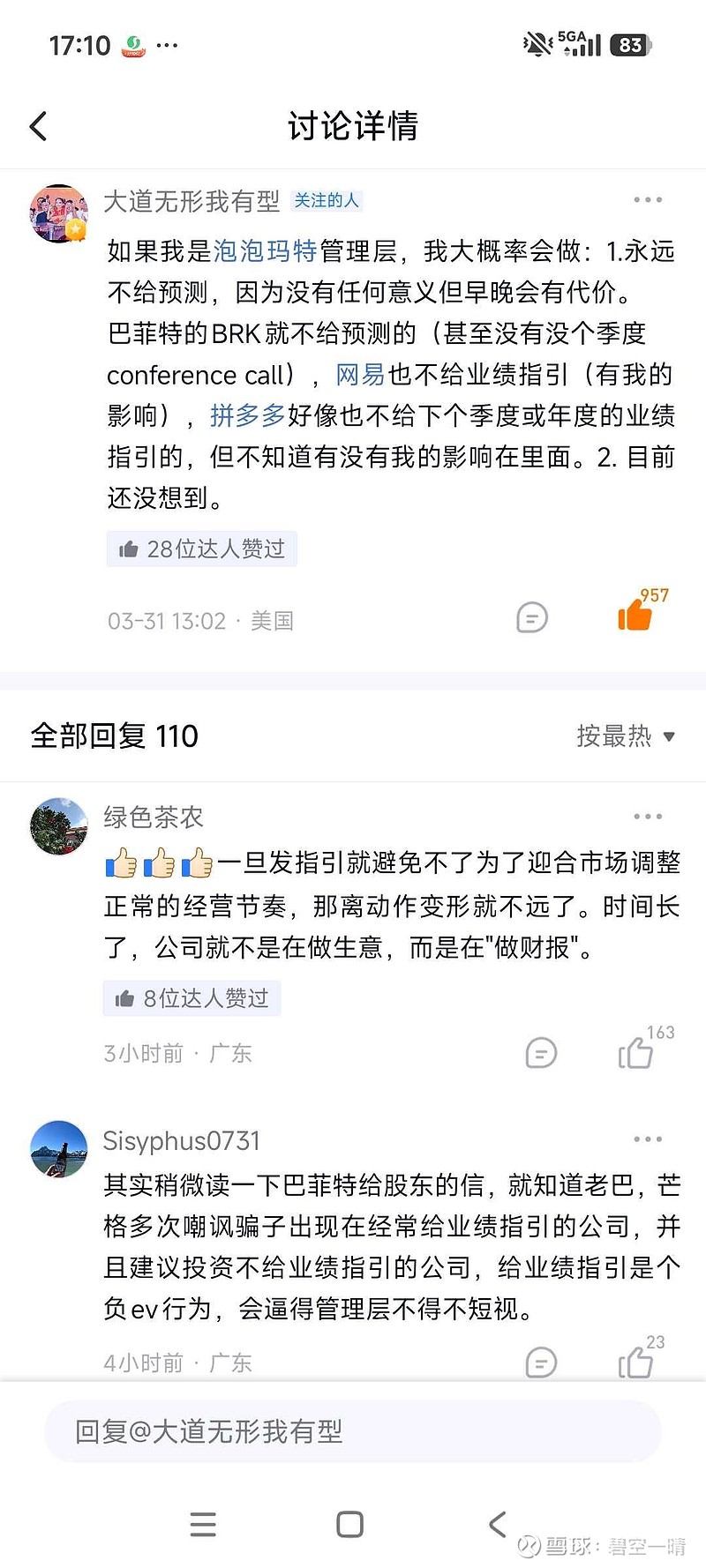 这几天冷静下来,看到泡泡的回购动作,又忍不住在150和145两个价格分别买回来一些,但不多。直到今天看到大道对所谓业绩指引的发言,真有佛家那种“尊者的棒喝”的感觉。确实,企业不给业绩指引是最好的,避免出现不做生意只做财报的事。至于后面怎么操作,还要再想想,对小家电和电影不太看好,饰品店也没见起色,后面还是花更多精力专注于生意本身吧。