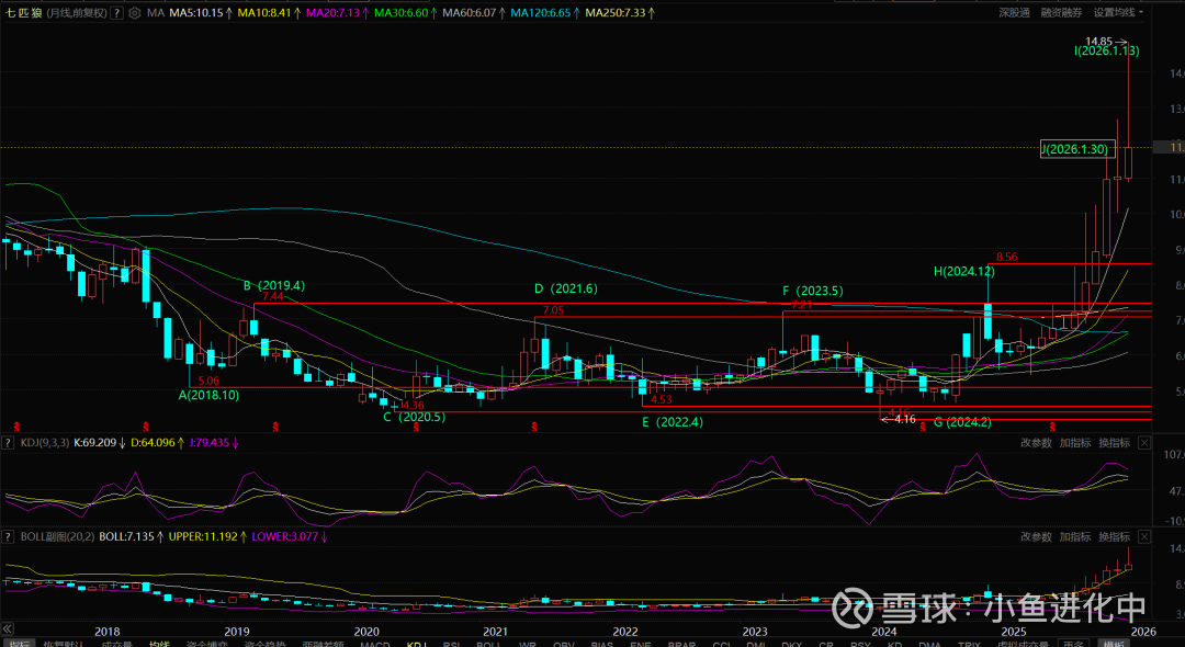 I点 (2026年1月13日):最高 14.85元 —— 当前周期的顶峰。