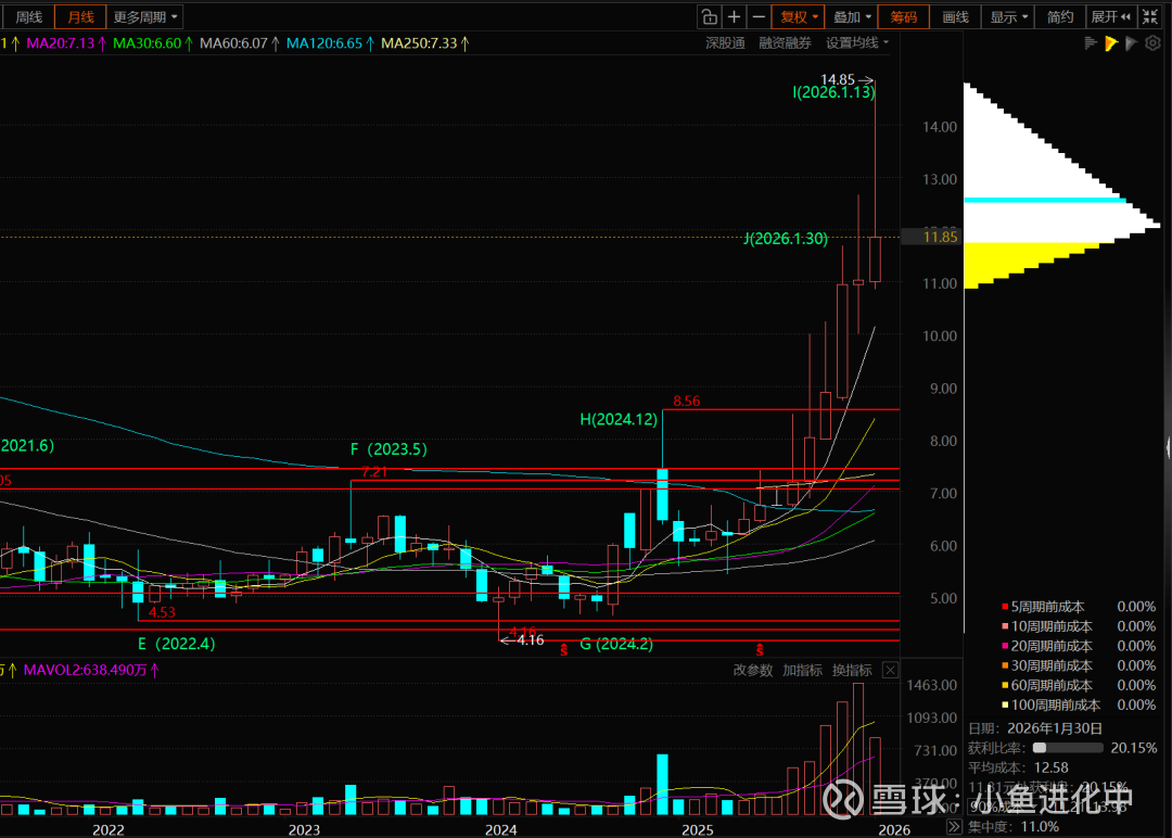 多数分析将本轮上行周期的起点锚定在2024年2月的4.16元。对于此后至14.85元这段涨幅显著的波段,其内部子浪结构的划分在技术上存在多种可能性。不同的划分方案会推导出不同的调整目标与后续推演。除了价格形态本身,市场的成本结构——例如在月线级别观察到的约11元附近的筹码集中区域——是需要纳入综合分析的重要参考因素。