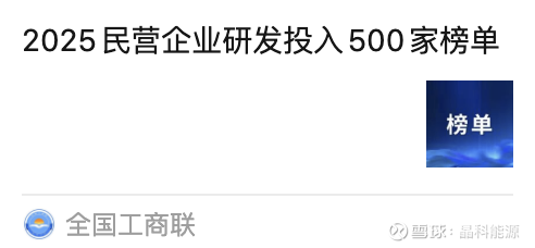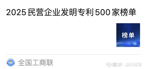 日前,全国工商联发布《2025民营企业发明专利500家榜单》和《2025民营企业研发投入500家榜单》。晶科能源凭借突出的自主创新能力与长期持续的研发投入,荣登上述两项榜单。尤其是在发明专利500强榜单中,晶科能源位居光伏行业第一,成为中国光伏领域发明专利数最多的企业。