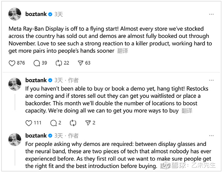 近日,Meta首席技术官安德鲁·博斯沃思(Andrew Bosworth)在Threads上发表文章称,Meta Ray-Ban Display智能眼镜在全美各地的线下零售店几乎全部售罄,11月之前的试戴预约也几乎全部排满。