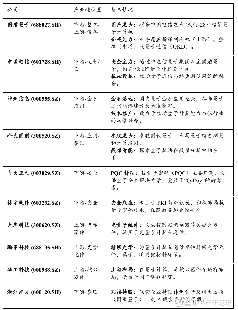 (1)上游(核心壁垒):包括稀释制冷机(Bluefors垄断,国内国盾量子突破)、低温线缆、量子芯片(超导/光/离子阱)、测控系统。该环节价值量占比约40%,是当前国产替代最迫切的领域。