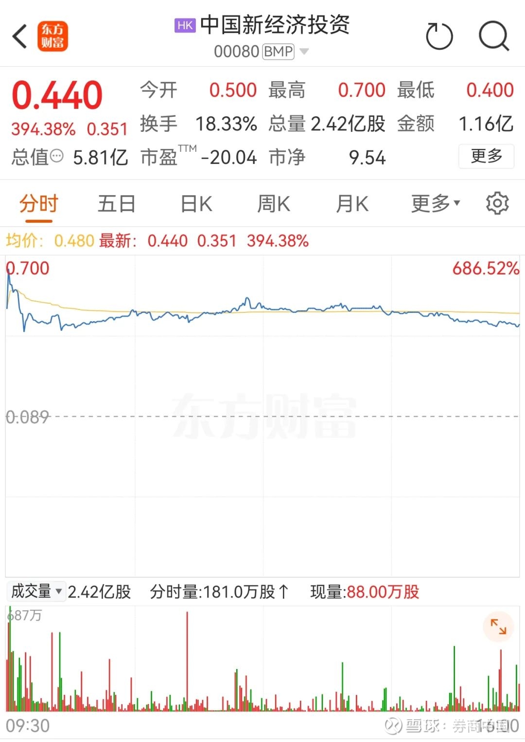 截至收盘,中国新经济投资的股价稍有回落,但涨幅仍接近400%,股价报0.44港元,市值为5.81亿港元。