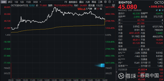 当地时间周一,华尔街一只名为Eightco的低价股突然大爆发,盘中涨幅一度超过5600%,并多次触发熔断机制。