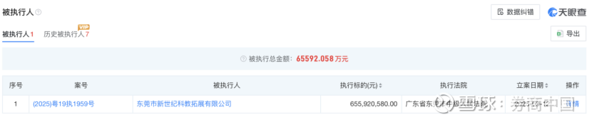 除了上述纠纷外,新世纪公司还有一单执行案件。天眼查信息显示,就在数日前(9月12日),东莞市新世纪科教拓展有限公司被广东省东莞市中级人民法院立案执行,案号为(2025)粤19执1959号,执行标的金额高达6.56亿元。这是新世纪公司今年以来标的金额最大的执行案件。