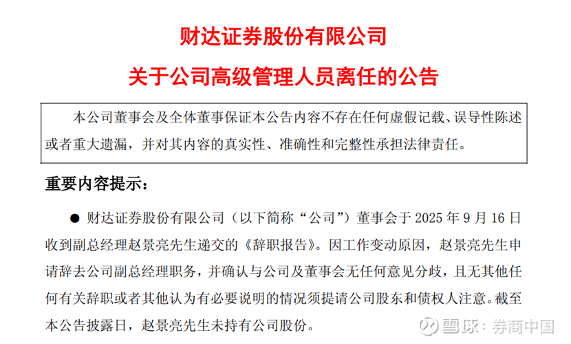 9月16日,财达证券发布公告称,公司董事会于2025年9月16日收到副总经理赵景亮递交的《辞职报告》。因工作变动,赵景亮申请辞去公司副总经理职务,并确认与公司及董事会无任何意见分歧,且无其他任何有关辞职或者其他认为有必要说明的情况须提请公司股东和债权人注意。截至公告披露日,赵景亮未持有公司股份。