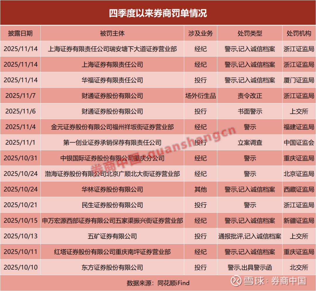 同花顺iFind数据显示,今年四季度以来,共有13家券商收到交易所及各地证监局罚单,涵盖上海证券、华福证券、华林证券、民生证券等。