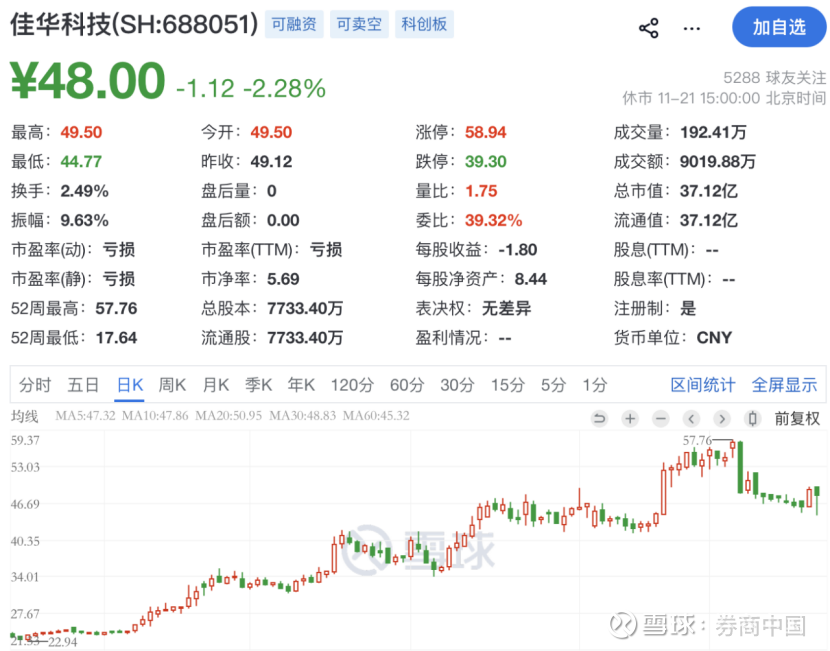 截至11月21日收盘,佳华科技股价报48元,当日收跌2.28%,年内累计涨幅超130%,总市值为37.12亿元。