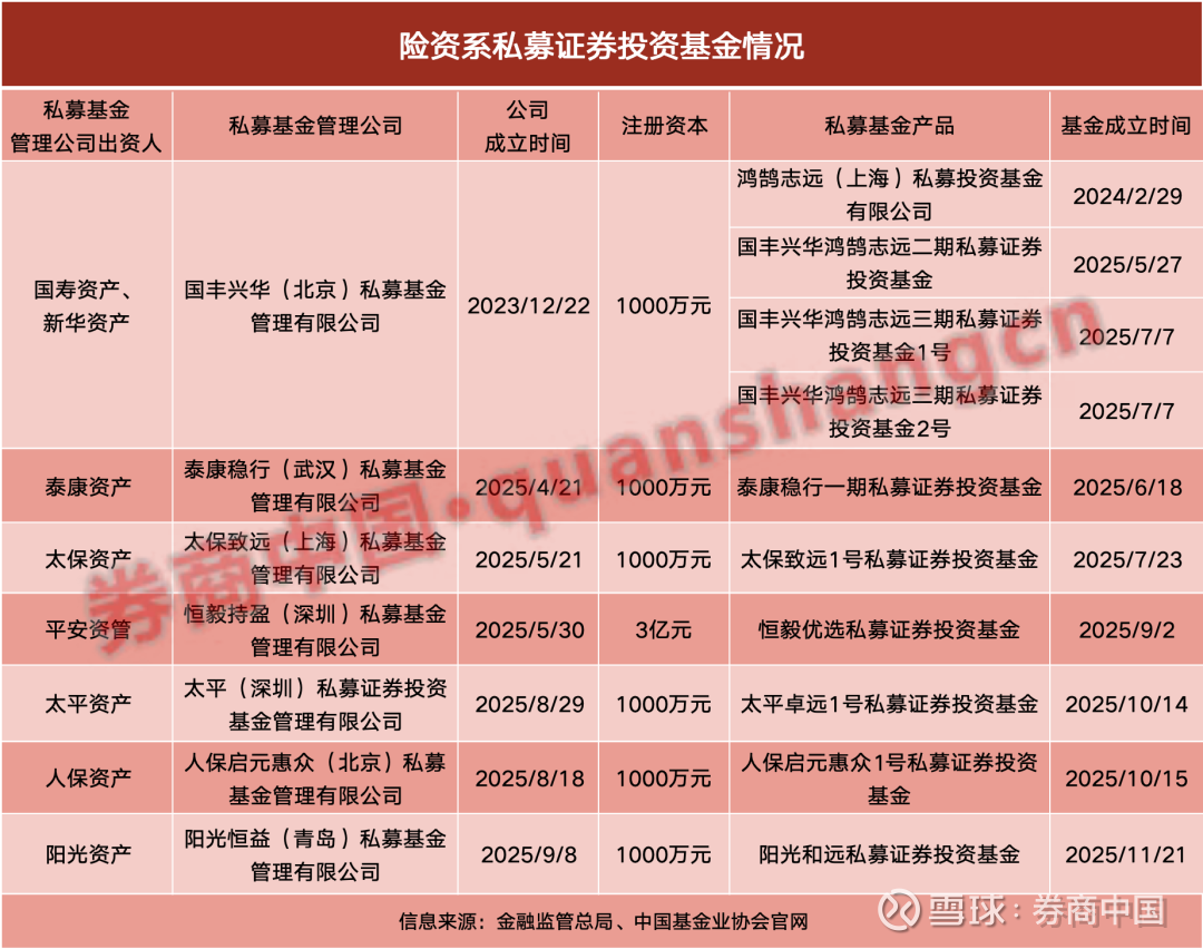 迄今已有7家保险系私募基金管理公司成立,其发起设立私募证券投资基金合计已达10只,均已进入运作阶段。包括:鸿鹄基金系列一期、二期、三期1号、三期2号,泰康稳行一期基金,太保致远1号基金,恒毅优选基金,太平卓远1号基金,人保启元惠众1号基金,阳光和远基金。