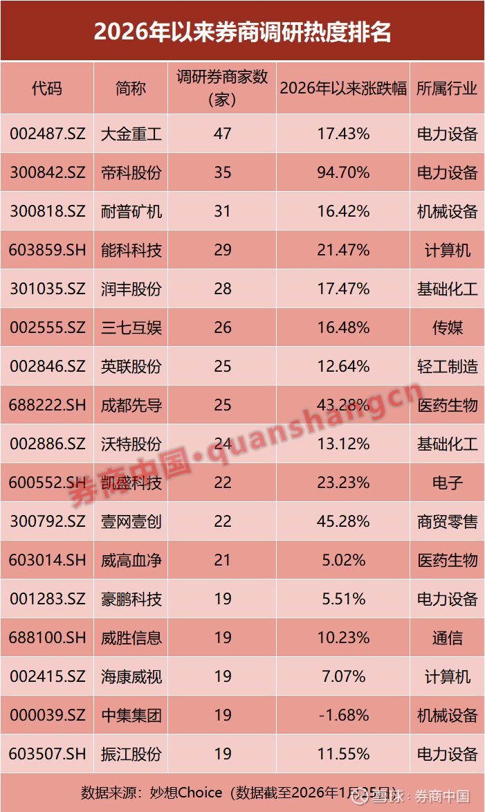 按照券商调研家数统计,大金重工、帝科股份、耐普矿机、能科科技、润丰股份、三七互娱近期人气最高,均获得超25家券商扎堆调研。