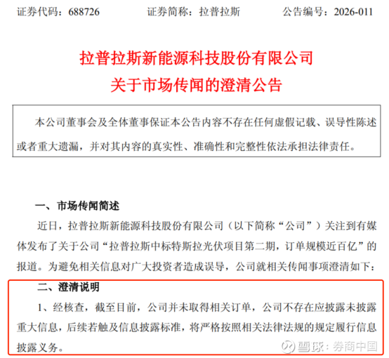 然而,拉普拉斯午间火速发布澄清公告称,经核查,截至目前,公司并未取得相关订单,公司不存在应披露而未披露的重大信息,后续若触及信息披露标准,将严格按照相关法律法规的规定履行信息披露义务。