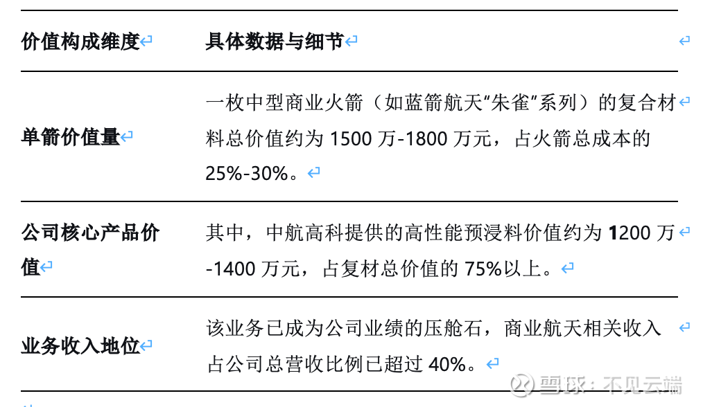 其市场统治力体现在惊人的数据上:在商业火箭复材预浸料环节,其市场份额超过95%,客户粘性极强。具体的价值贡献可以从单箭维度清晰量化: