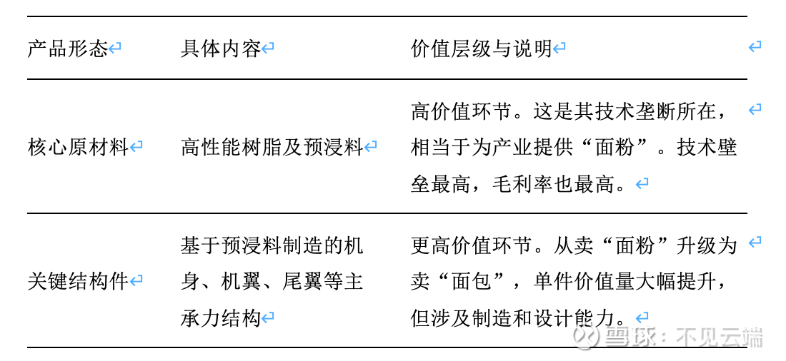 其核心逻辑是军用技术的降维应用与产业链生态构建:将用于歼-20、C919的顶尖航空预浸料和复合材料制造技术,通过适应性开发和规模化生产进行降本,移植到eVTOL、高端无人机等飞行器上。公司正从提供“面粉”(预浸料)向提供“面包”(机身、机翼等大型主承力结构件)延伸,价值量有望实现数倍提升