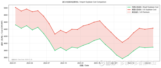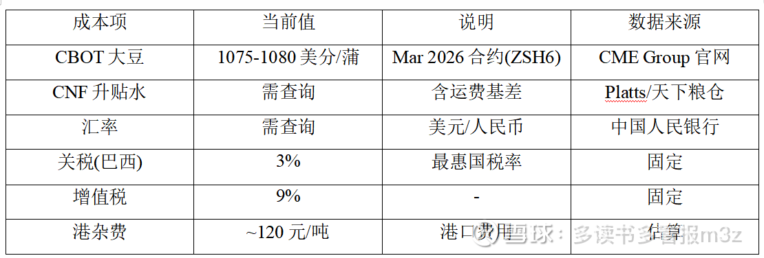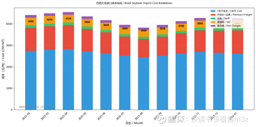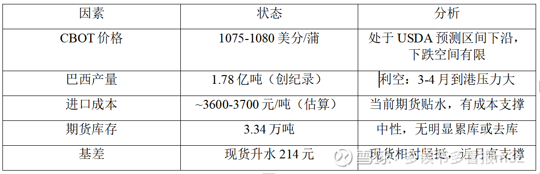 供给端结论:全球供应充足(巴西丰产),但CBOT已在低位,进口成本形成价格底部支撑。3-4月巴西到港高峰是主要压力窗口。