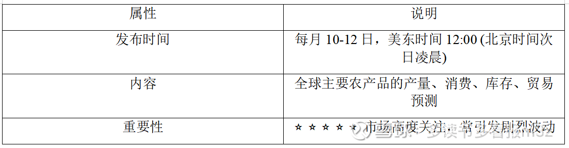 WASDE (World Agricultural Supply and Demand Estimates) 是每月发布的全球农产品供需预测报告。