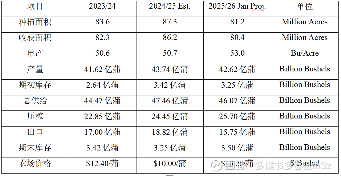 价格指引:USDA预测2025/26年度美豆农场均价$10.20/蒲(较2023/24年度的$12.40下降18%),对应CBOT期货约980-1050美分/蒲区间。期末库存增至3.5亿蒲,库存水平宽松。