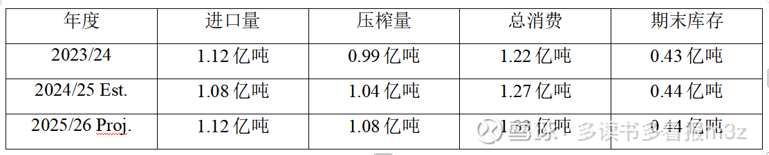 注意:2024/25年度中国进口预估为1.08亿吨,较2023/24年度下降3.6%,主要受养殖利润下滑影响。2025/26年度预计恢复至1.12亿吨。