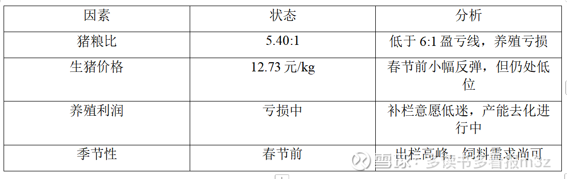 需求端结论:养殖端深度亏损(猪粮比5.4),产能去化仍在进行。短期春节备货支撑需求,但中期补栏动力不足,需求偏弱。