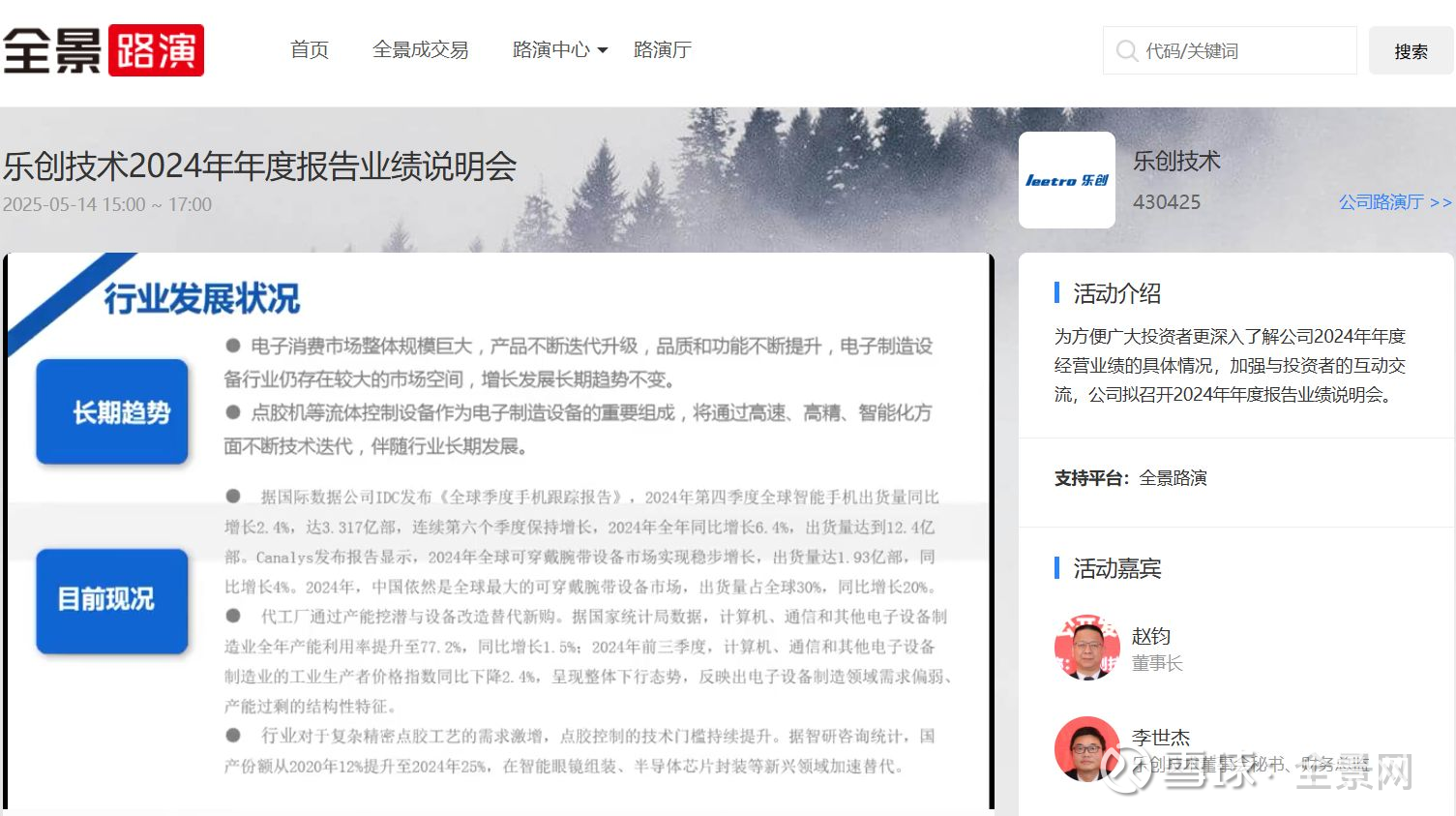 5月14日,乐创技术(430425)2024年年度报告业绩说明会在全景路演成功举办。