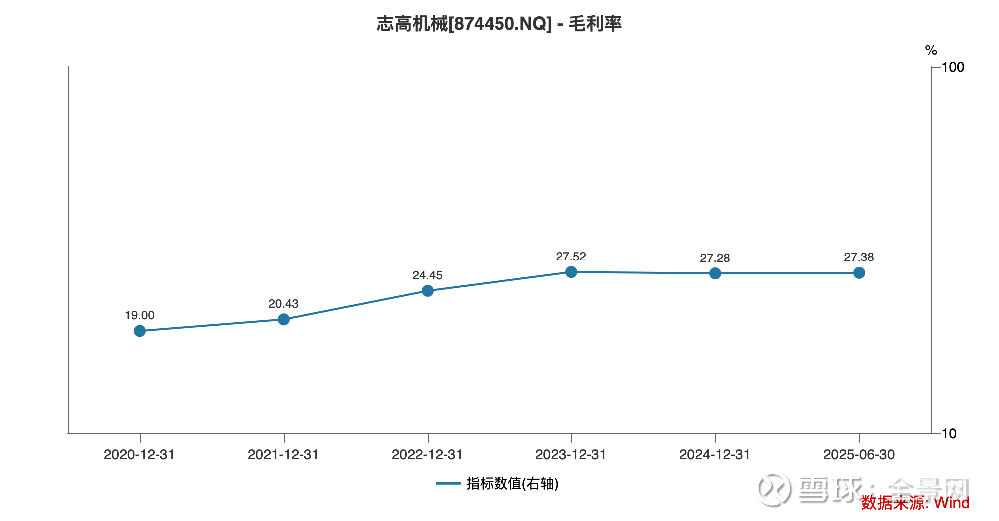 传导至利润端,技术优势持续扩大的志高机械,其整体毛利率水平呈现稳定增长态势,从2020年的19%增至2024年的27.28%。