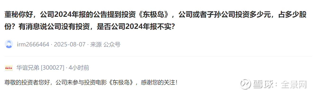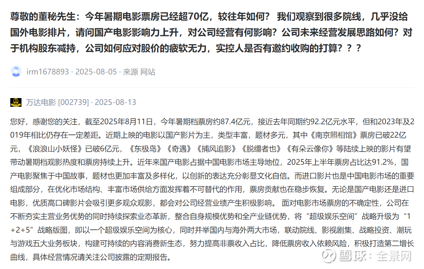 由于电影票房也对相关公司的股价波动带来影响,在互动平台上,投资者对相关电影的制作方、投资方给予关注,全景为您精选来自上市公司最真实的声音。(以下内容均摘自深交所互动易、上证e互动、上市公司公告等)