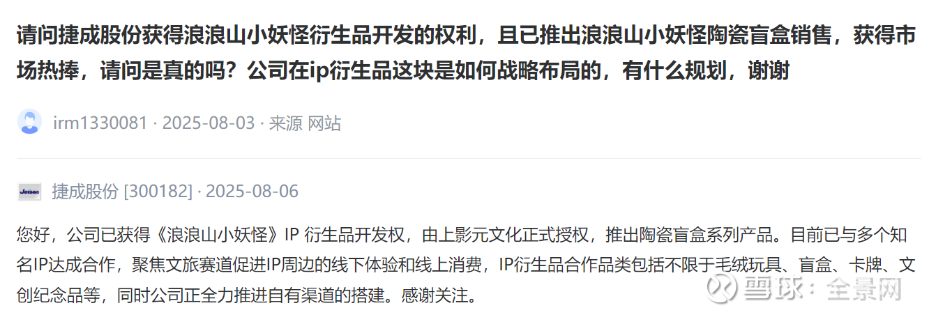 【投资者问】捷成股份获得浪浪山小妖怪衍生品开发的权利,且已推出浪浪山小妖怪陶瓷盲盒销售,获得市场热捧,请问是真的吗?公司在ip衍生品这块是如何战略布局的,有什么规划?