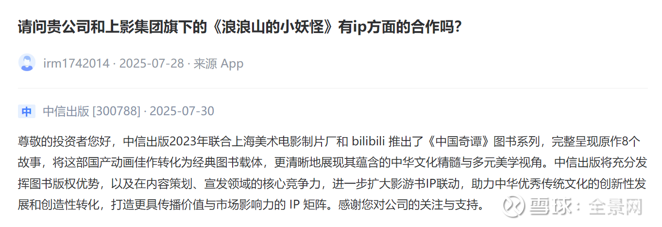 【投资者问】贵公司和上影集团旗下的《浪浪山的小妖怪》有ip方面的合作吗?