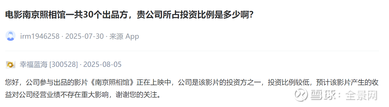 【投资者问】电影南京照相馆一共30个出品方,贵公司所占投资比例是多少啊?