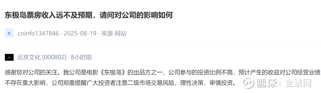 北京文化 [000802] :我公司是电影《东极岛》的出品方之一,公司参与的投资比例不高,预计产生的收益对公司经营业绩不存在重大影响,公司郑重提醒广大投资者注意二级市场交易风险,理性决策,审慎投资。