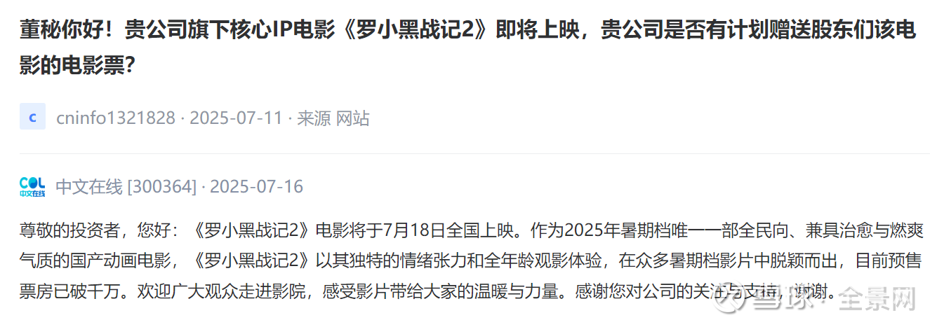 【投资者问】贵公司旗下核心IP电影《罗小黑战记2》即将上映,贵公司是否有计划赠送股东们该电影的电影票?