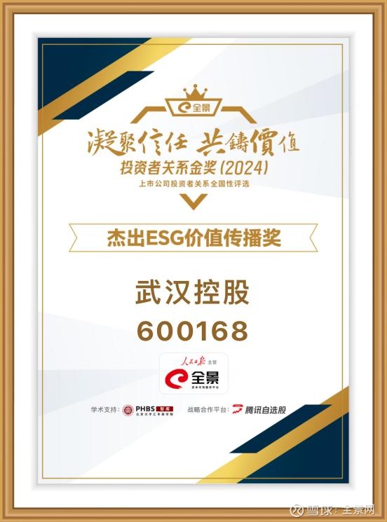 日前,在2025年第六届全景网"凝聚信任 共铸价值"上市公司投资者关系全国性评选活动中,武汉控股荣获"杰出ESG价值传播奖"。"全景ESG价值传播奖"由全景网发起,经由沪深北交易所、投服中心、机构高校等专家评审,聚焦上市公司ESG信披深度及其对于利益相关者,尤其是投资者维度的传播效果。该奖项旨在提供深入的ESG评估视角,展示上市公司ESG实践成果,助力投资者做出更明智的投资决策。
