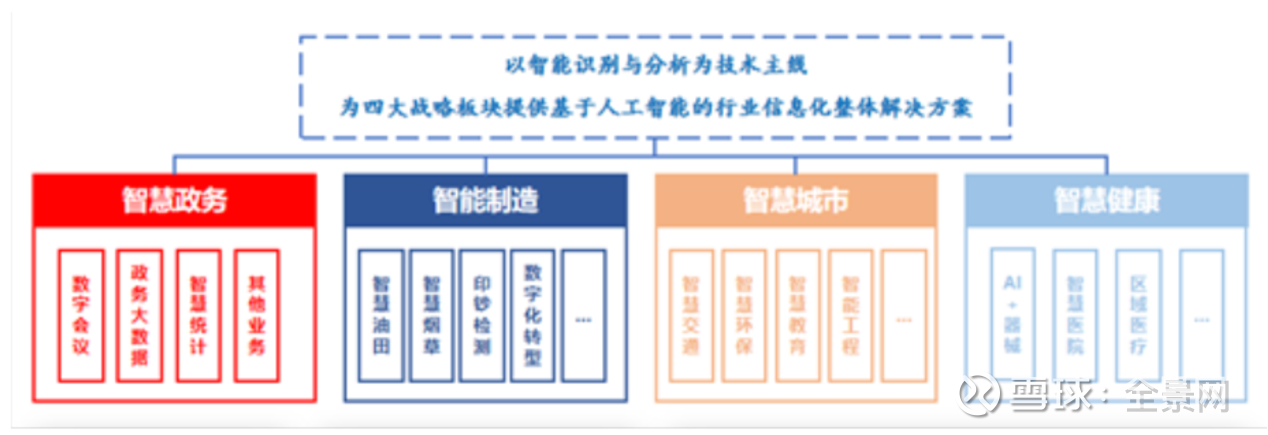 烟草行业信息化方面,公司拥有烟叶种植分析、病虫害防护、产量预测、烟叶质量追溯、卷包数据采集、工业大数据分析、机器视觉检测等产品;印钞检测领域拥有印版检测、防伪线检测、钞票纸质量检测、自动化设备、智能安防等产品,也是全球唯一能提供"制版-防伪线-钞票纸-印刷全流程AI检测方案"的企业;石油领域数字化管理具备油气田数据采集、智能调度、智能安防、应急管理平台等产品;智慧政务领域包含智慧组工、人大、政协系统,经济大脑、产业大脑、统计大数据平台等产品;智慧医疗领域拥有智能麻醉机器人、医学装备物联网监控系统、医疗设备调配平台、医学影像辅助诊疗系统、放射肿瘤学教考平台等产品。