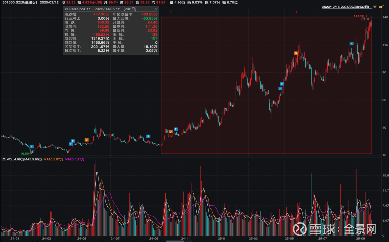 在传统业务受益于汽车后市场扩容与进口替代之际,公司新业务更是卡位人形机器人量产红利,形成"双轮驱动"格局。资本市场方面,自2024年9月24日起,公司股价表现出积极的上涨行情,近期走势相对稳健,截至2025年9月25日的累积涨幅达到了447.9%,期间参与资金达到了1319.27亿元,累积增长市值超170亿元。
