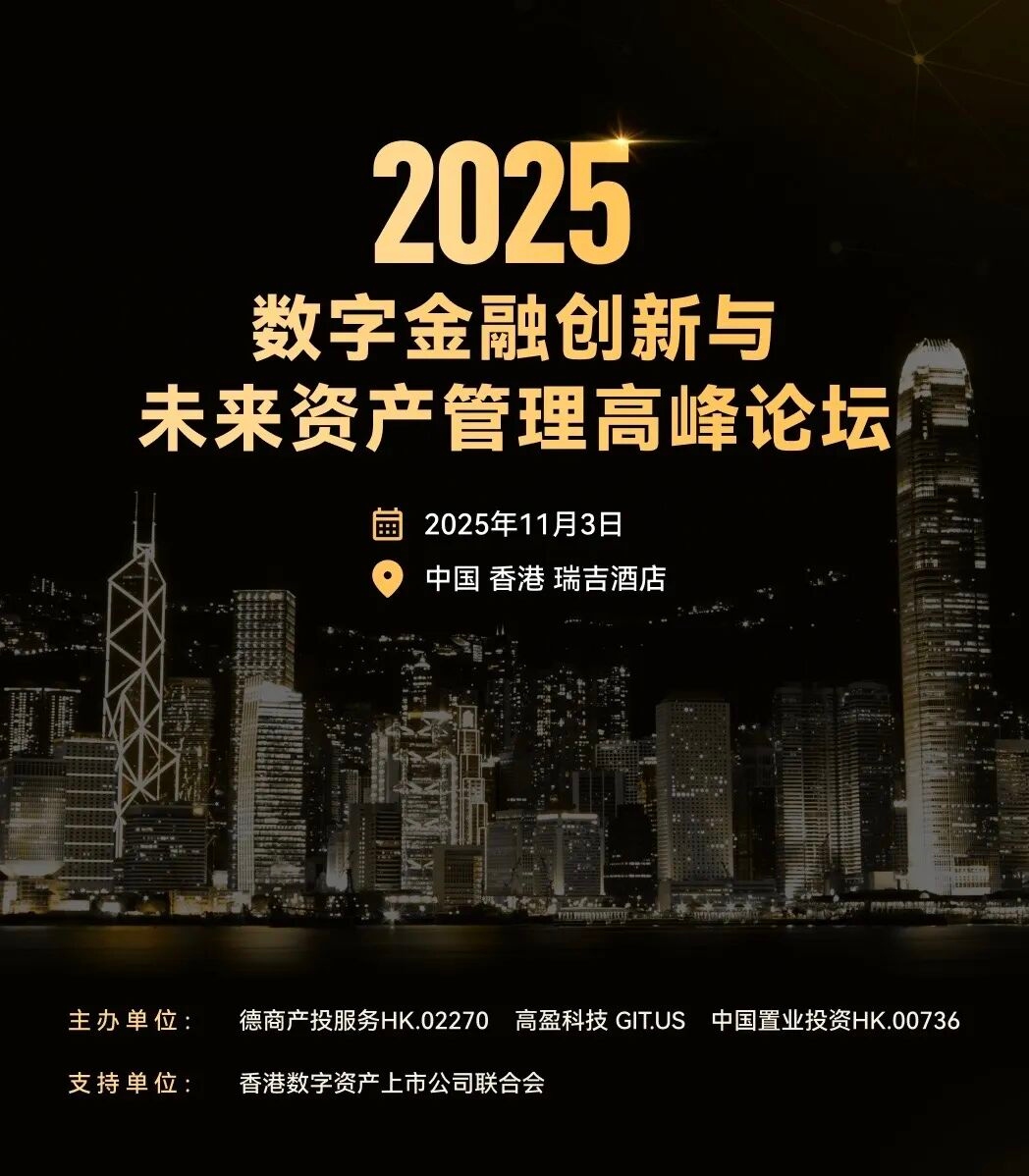 由德商产投服务集团(HK.02270)、高盈科技(GIT.US) 与 中国置业投资(HK.00736) 联合主办,香港数字资产上市公司联合会鼎力支持的 “2025数字金融创新与未来资产管理高峰论坛”,将于 2025年11月3日 在 中国香港瑞吉酒店 隆重举行。