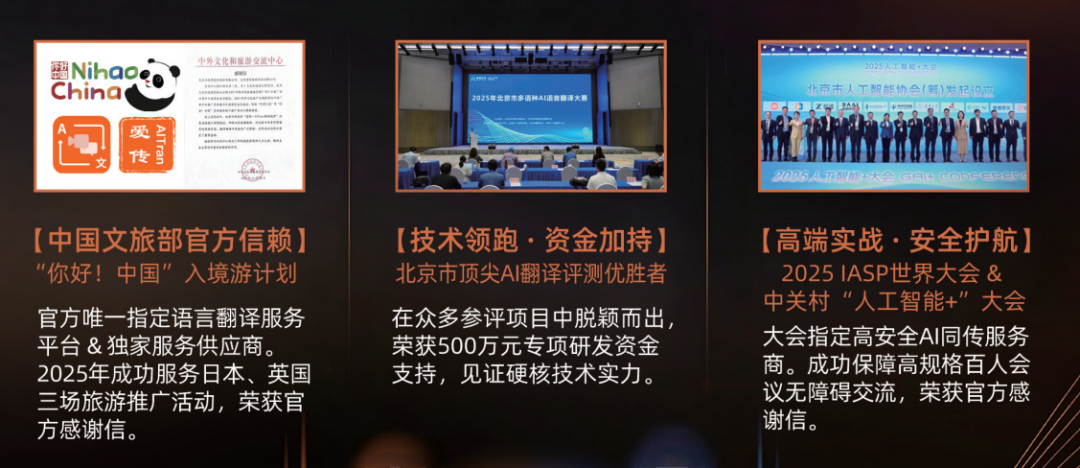 爱传(AITran)自2024年4月问世以来,已为众多国际活动提供翻译服务,包括2025年IASP世界大会、东京中日文化旅游交流活动、英国文化旅游交流活动等提供现场AI翻译支持,有力推动了AI翻译技术的产业化落地,多次收到官方感谢信。此次亮相,是爱传作为文化和旅游部中外文化和旅游交流中心指定供应商,持续助力中国文旅国际推广的重要体现。
