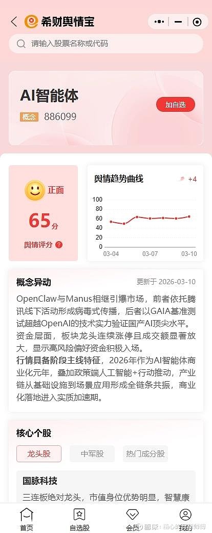 早上看了一下关于AI智能体概念最新异动分析——OpenClaw与Manus相继引爆市场,前者依托腾讯线下活动形成病毒式传播,后者以GAIA基准测试超越OpenAl的技术实力验证国产AI顶尖水平。资金层面,板块龙头连续涨停且成交额显著放大,显示高风险偏好资金积极入场。行情具备阶段主线特征,2026年作为AI智能体商业化元年,叠加政策端人工智能+行动推动,产业链从基础设施到场景应用形成全链条共振,商业化落地进入实质加速期。