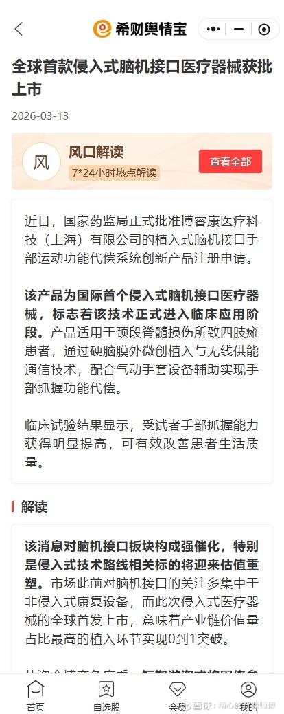 午后收到有关这一消息影响分析的推送——该消息对脑机接口板块构成强催化,特别是侵入式技术路线相关标的将迎来估值重塑。市场此前对脑机接口的关注多集中于非侵入式康复设备,而此次侵入式医疗器械的全球首发上市,意味着产业链价值量占比最高的植入环节实现0到1突破。从资金博弈角度看,短期游资或将围绕参股关联标的展开接力炒作,但由于A股缺乏直接上市主体,资金可能向上游核心硬件及参股公司集中。