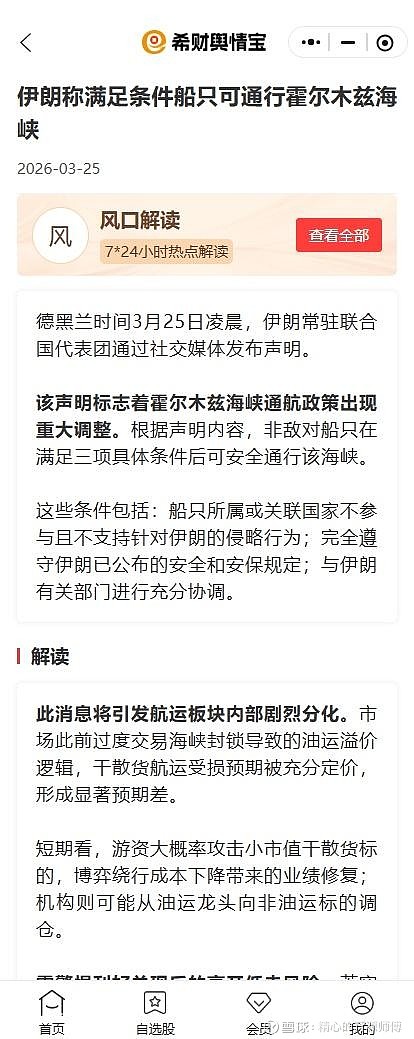 看了一下更新的对这一消息的解读分析——此消息将引发航运板块内部剧烈分化。市场此前过度交易海峡封锁导致的油运溢价逻辑,干散货航运受损预期被充分定价,形成显著预期差。短期看,游资大概率攻击小市值干散货标的,博弈绕行成本下降带来的业绩修复;机构则可能从油运龙头向非油运标的调仓。