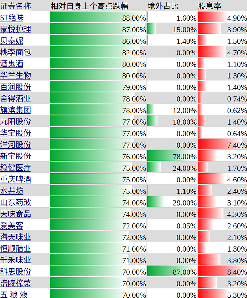 统计了一下股票池公司相对于上个高点的跌幅,超过70%的公司,一共25家。特别看了一眼境外营收的占比,普遍较低,超过10%的,只有6家。没想到山东药玻,境外占比接近30%。科思股份和新宝股份,境外占比超过70%。此外,即使跌幅70%+,股息率超过5%的,只有3家,而且3家,业绩都是下滑的