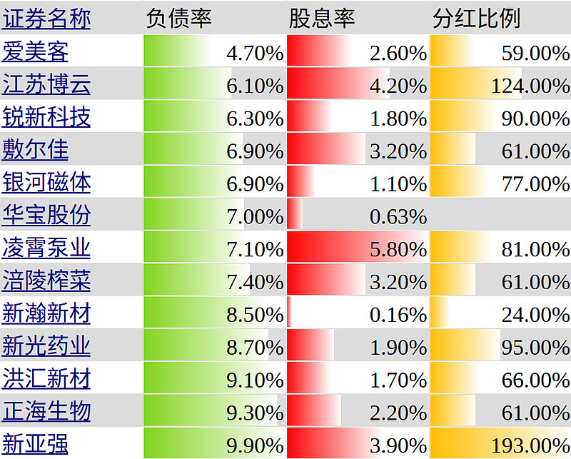 复习一下股票池内,负债率低于10%的公司。资产负债表的复杂性,往往都是负债带来的。负债率低,和资产负债表简单,高度相关。这些公司,大部分分红比例很高(可能是我选股偏好带来的)。可惜,股息率只有一家凌霄泵业超过5%