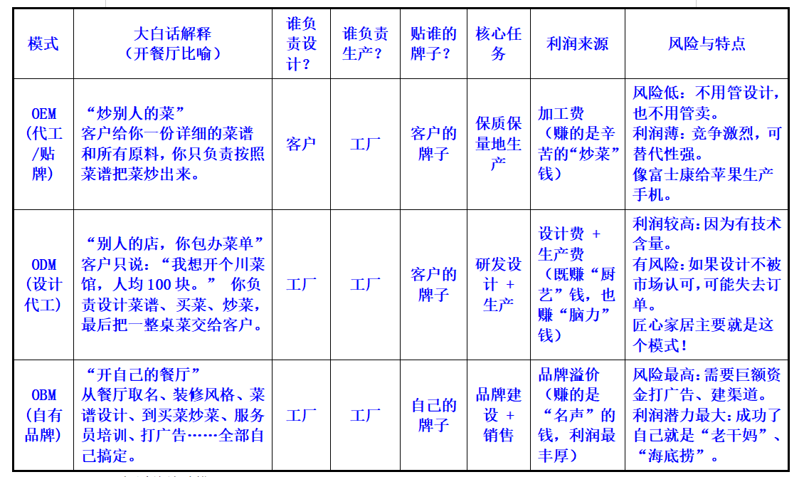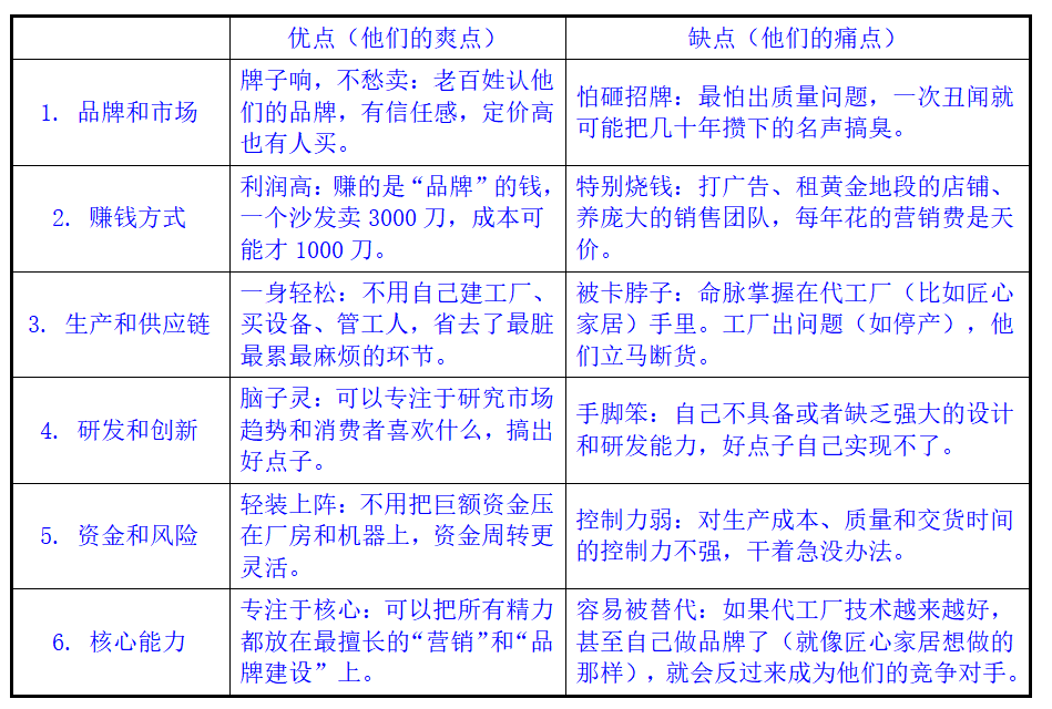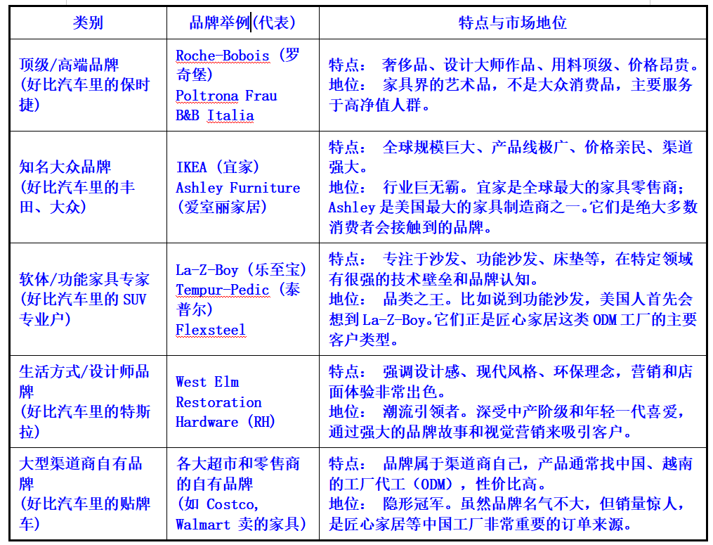 和匠心家居的关系:表格中后三类——“软体专家”、“生活方式品牌”和“渠道商自有品牌”——正是匠心家居最重要的客户类型。它们负责品牌和销售,匠心负责研发设计和生产。