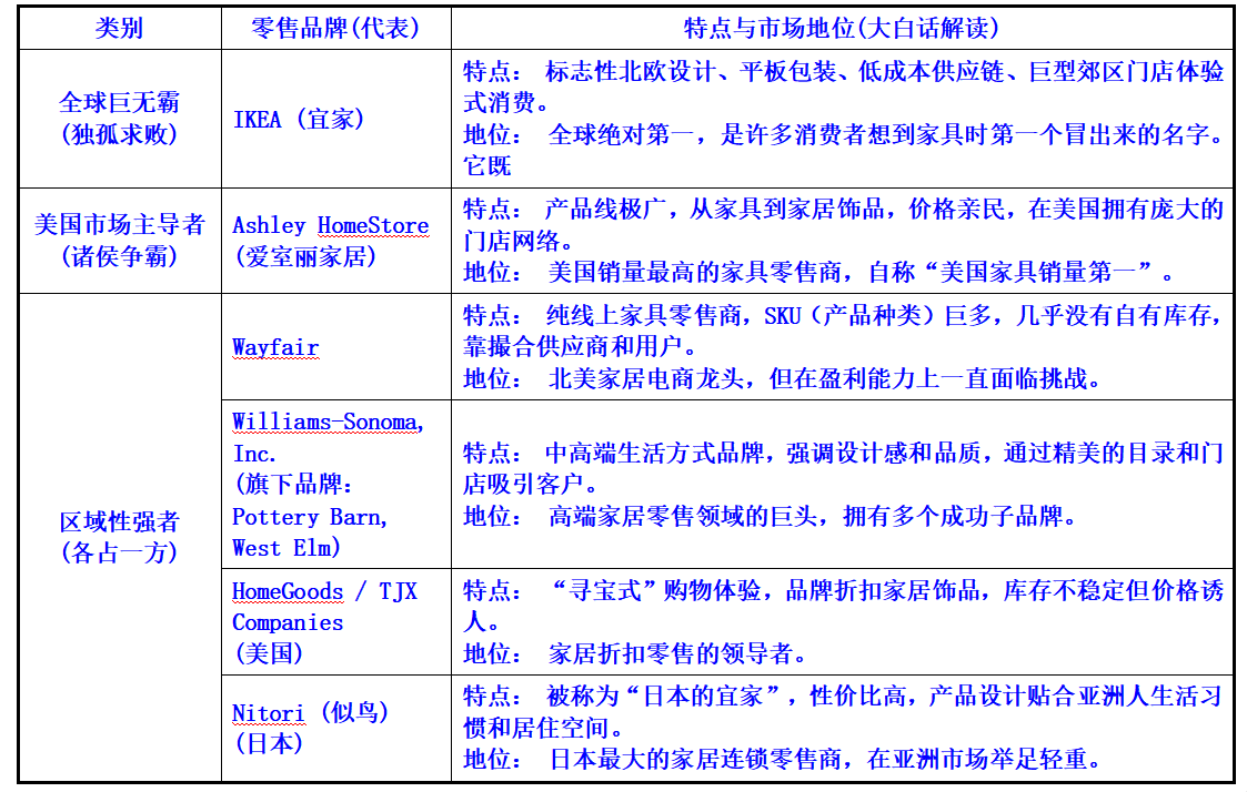 与匠心家居的关系:这些大型零售商,特别是 Ashley、Wayfair、Williams-Sonoma 等,都是中国ODM/OEM工厂(如匠心家居)的核心客户。它们下订单,匠心家居等工厂负责生产,然后贴上零售商的品牌或直接销售。