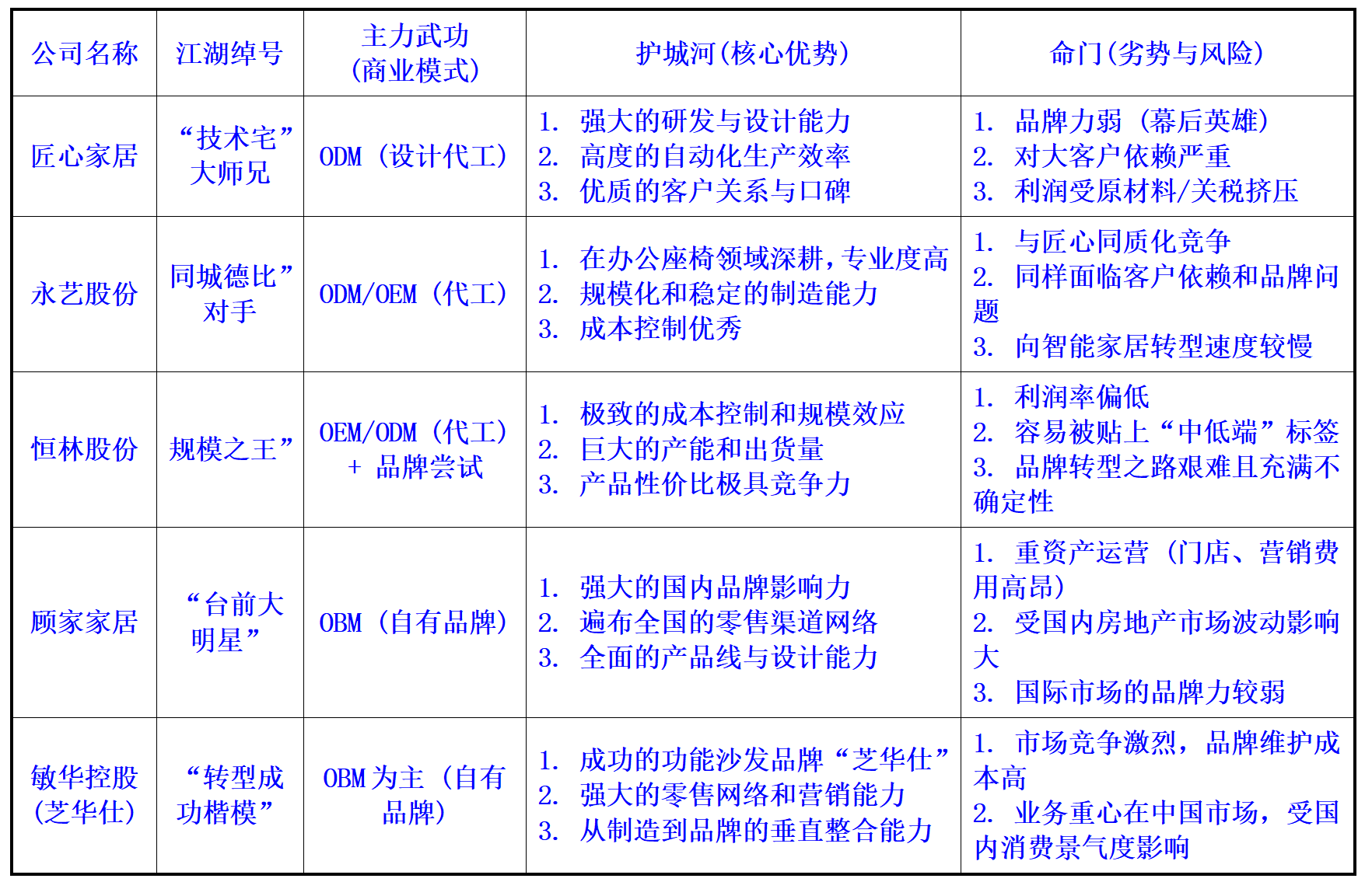 第五:咱们就像点评武林高手一样,来详细扒一扒匠心家居所在的这个“智能家具制造”江湖里,几位主要的上市公司对手都有哪些看家本领和独门绝技(护城河),以及他们的命门又在哪里。